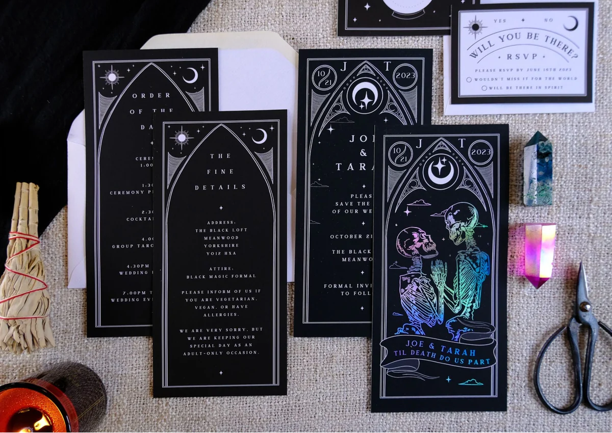 The most exciting part is seeing your invitations in person. We always send over a digital draft first so you can check every detail and be 100 percent happy before we go to print. Once they are ready, they are carefully packaged and shipped via DPD or FedEx with full tracking. There is nothing quite like that moment when you open the box. We truly believe these designs look even better in your hand than they do on a screen. These invitations are for the niche who want something dark, alternative, and unique. We know they create a massive impact because our reviews are full of couples telling us their guests said these were the most amazing invitations they had ever seen.