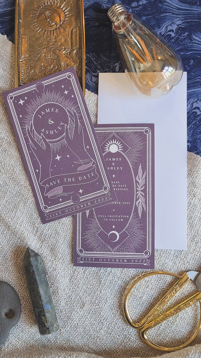 - Format: High-quality flat Save the Date card with a mystical tarot-inspired design.