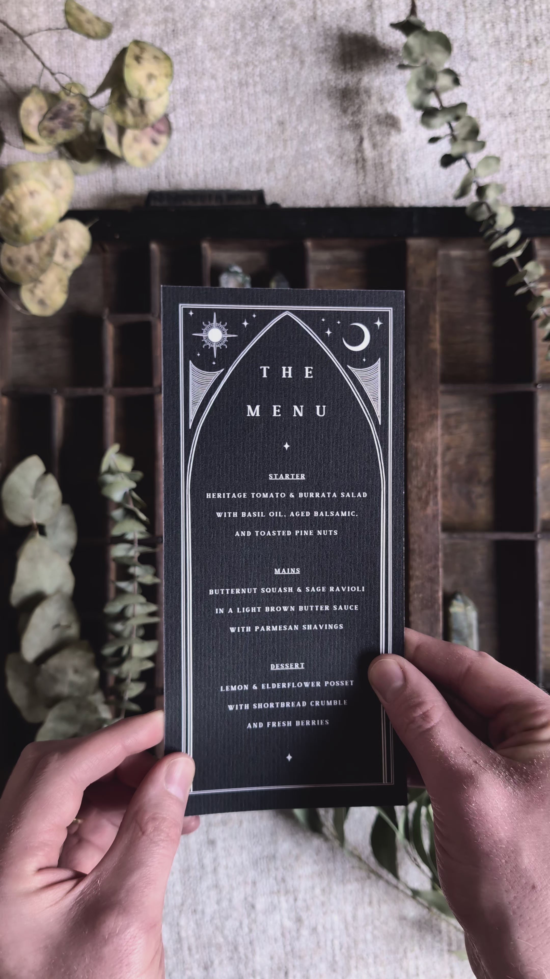 Ideal for celestial, spiritual, vintage, or alternative weddings, these menu cards add a luminous and meaningful touch to your tablescape, capturing the energy of a love that lights the way forward.