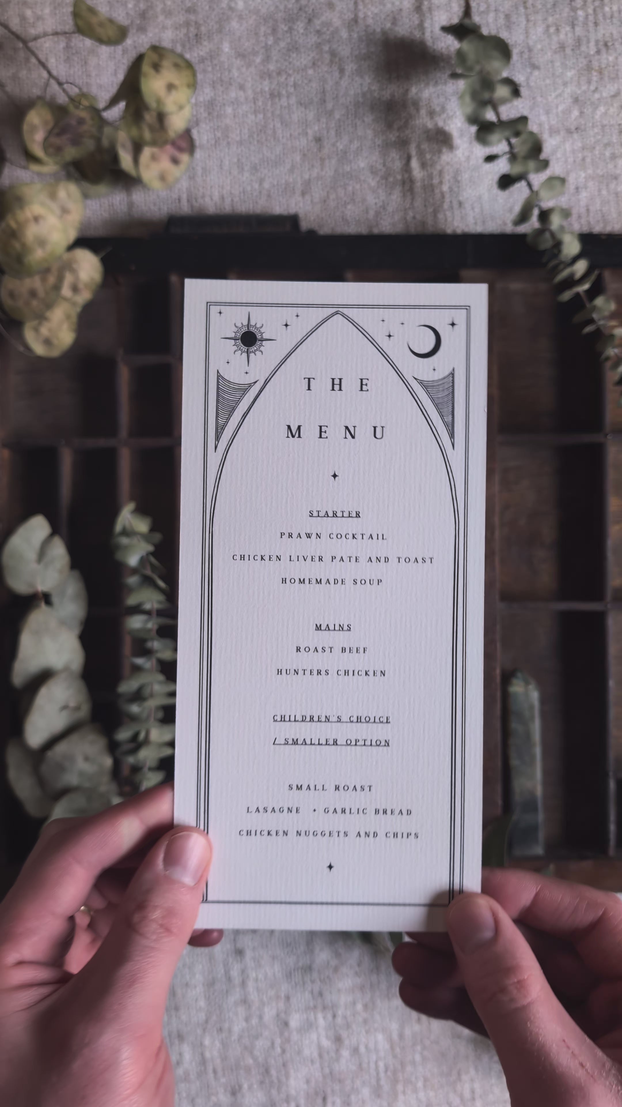 • Design: Rose tarot artwork on one side; personalised menu on the other.