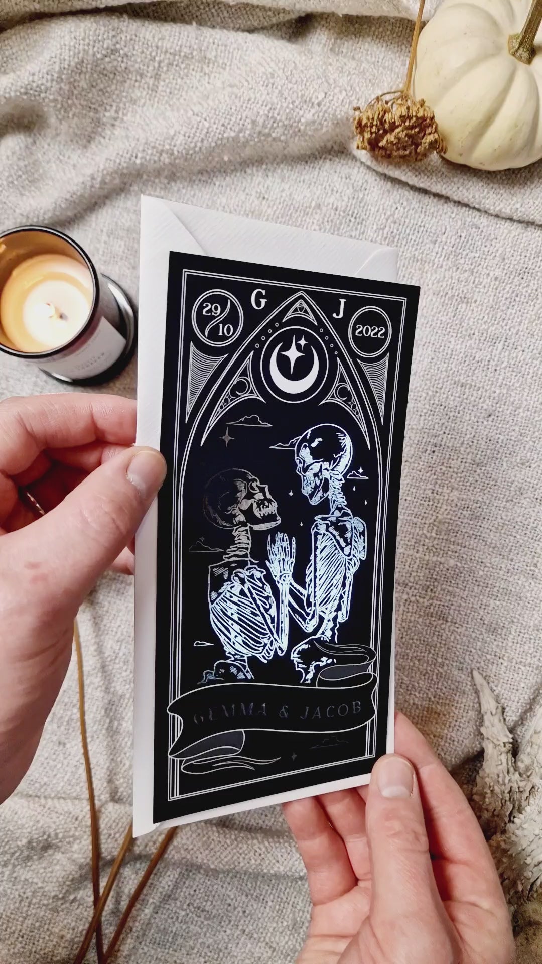 Make a statement of everlasting devotion with the stunning 'Til Death Do Us Part' Foiled Tarot Card Save the Dates. With intricate foiled details, these cards offer a perfect blend of elegance and gothic romance, setting the tone for a wedding to remember.