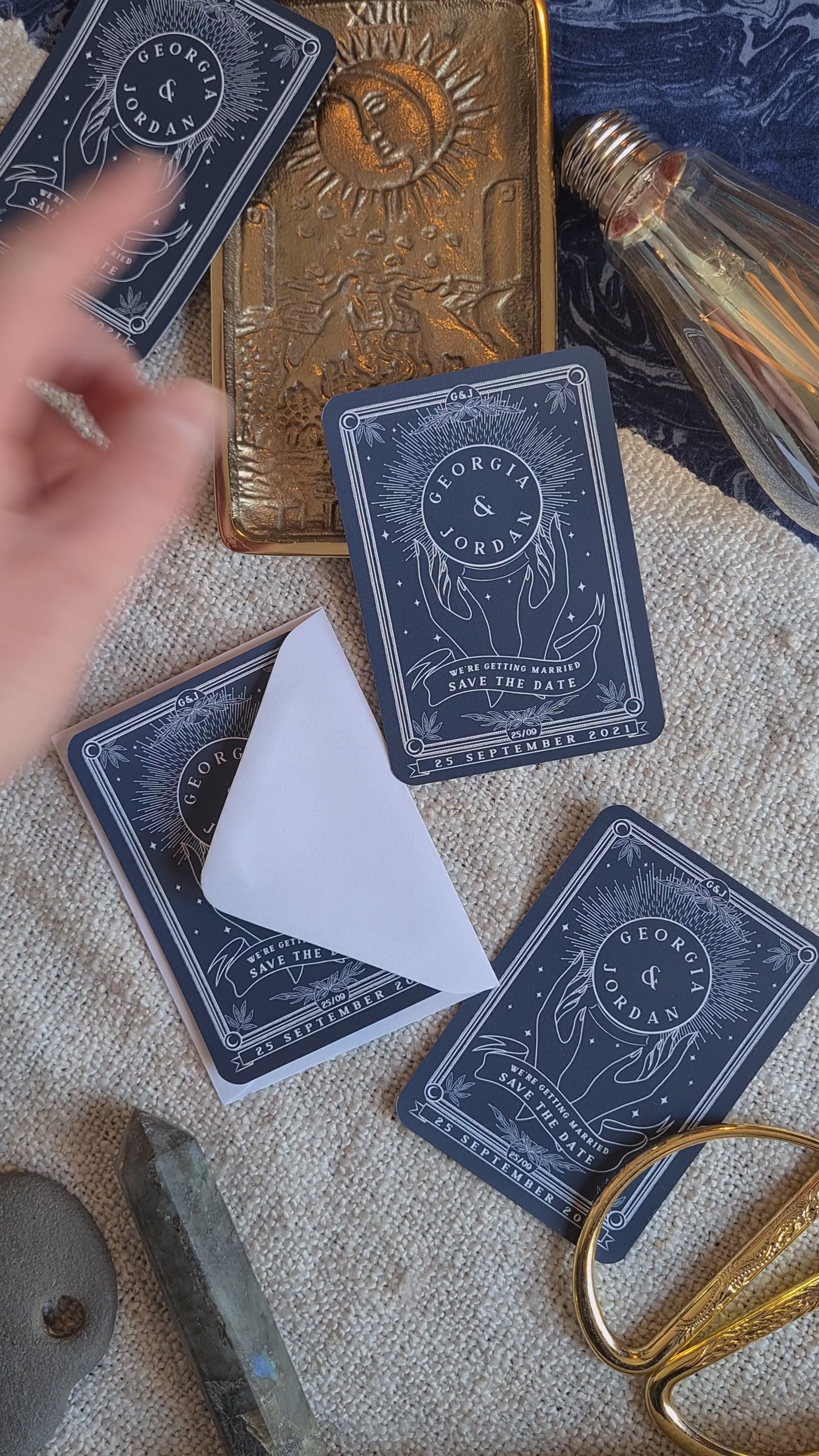 Your Crystal Ball Tarot Save The Date Mini Magnet can be printed in any colour or gradient to align with your wedding theme. Simply include your preferences in the order notes, and we’ll craft a design that captures the unique magic of your love story.